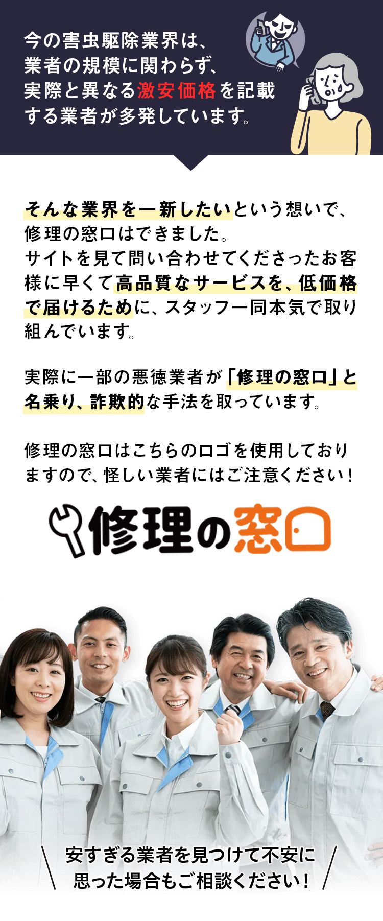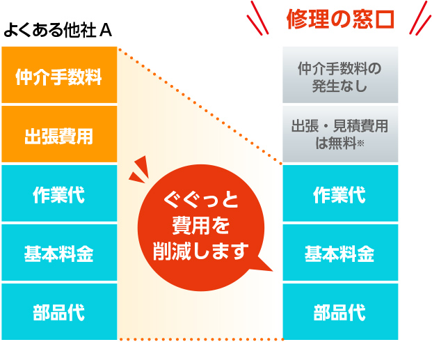 仲介業者を挟まず、受付から作業完了まで一貫して自社で対応しているので、仲介手数料がゼロ!